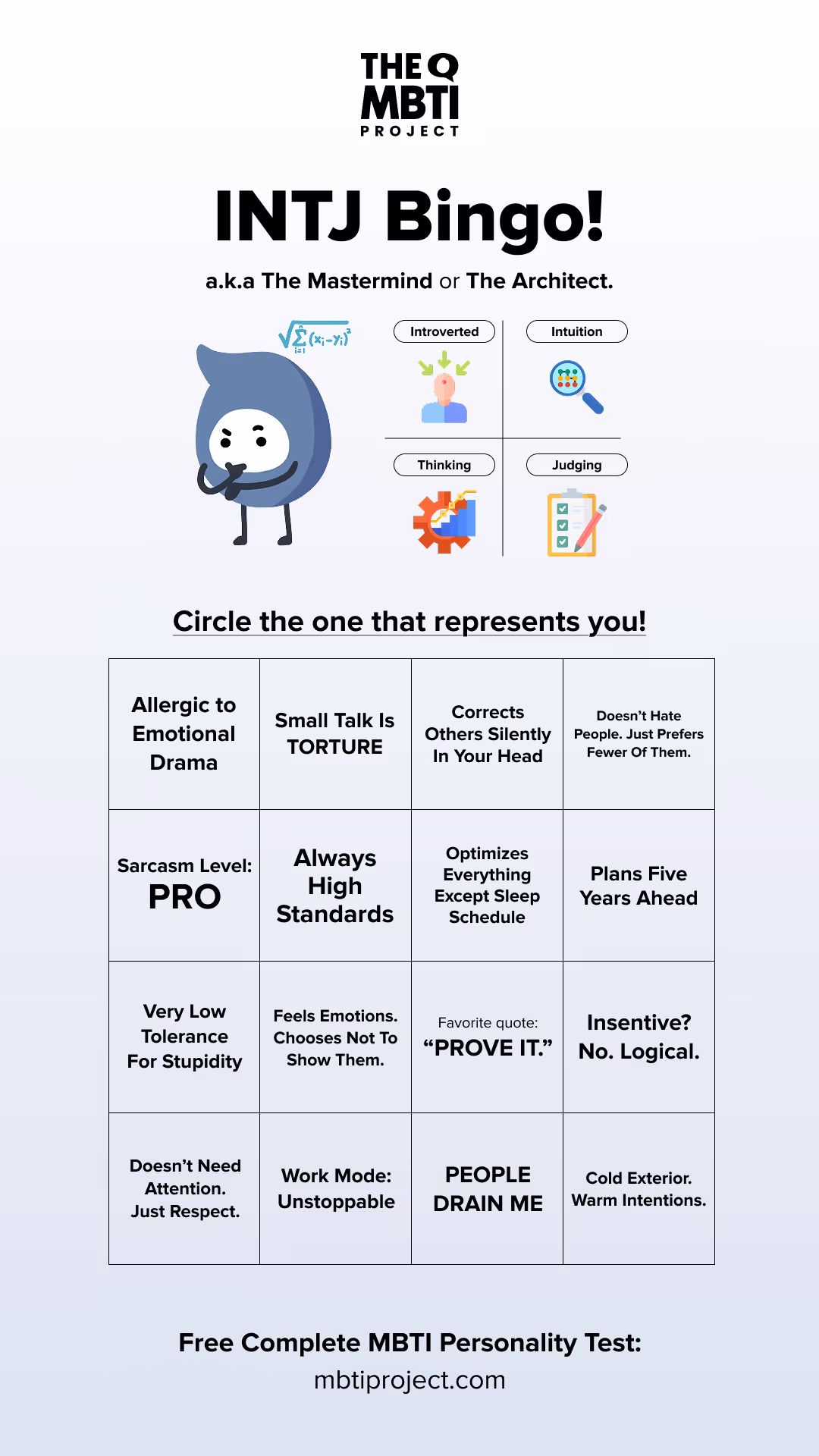 INTJs earn the titles The Architect & The Mastermind because they instinctively design mental maps and design effective solutions before taking action. Like an architect, they see how individual components fit into a larger system. Like a mastermind, they continuously refine strategies by anticipating outcomes long before most people recognize the pattern.